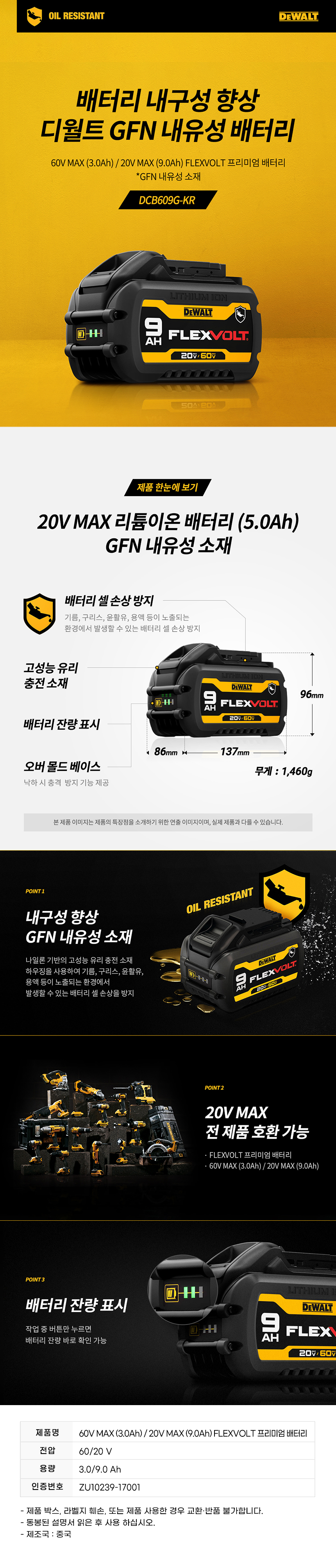디월트 DCB609G 20V 60V 9.0Ah 내유성 플렉스볼트 프리미엄 리튬이온 배터리