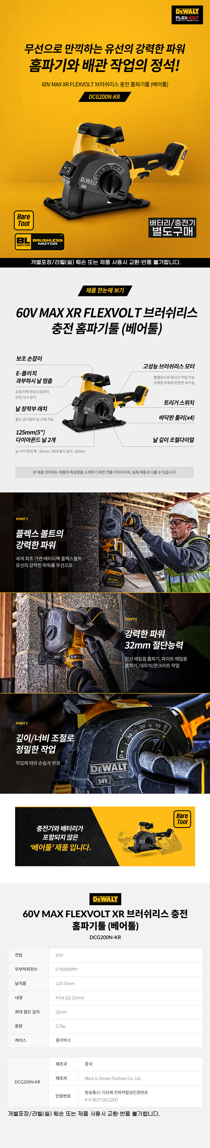 디월트 60V MAX FLEXVOLT XR 브러쉬리스 충전 홈파기툴 베어툴 DCG200N
