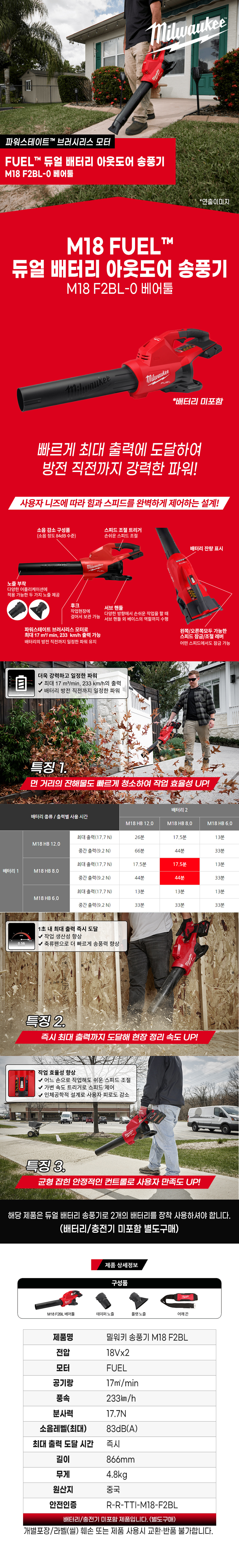 밀워키 18V FUEL 듀얼 배터리 아웃도어 송풍기 베어툴 M18 F2BL-0 블로워 브로워 청소 낙엽 눈 세차