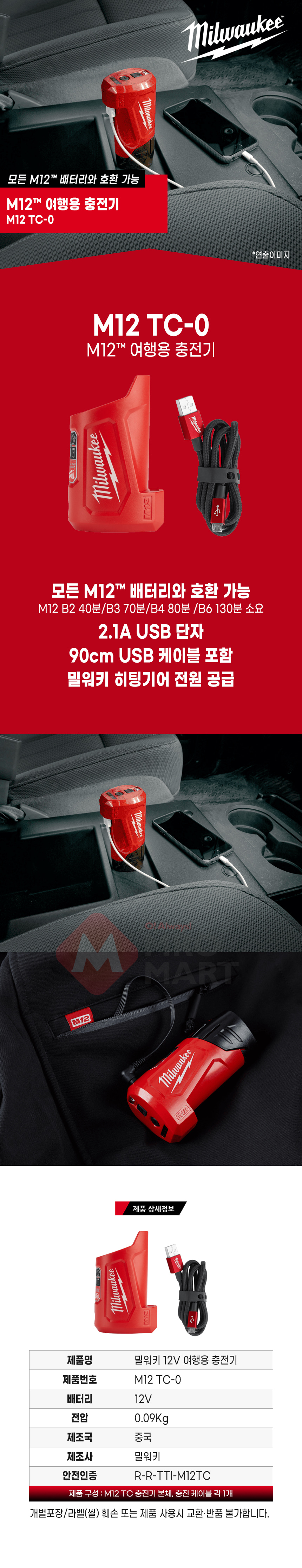 밀워키 12V 여행용 충전기 M12 TC-0 휴대 차량 USB 핸드폰 히팅기어용