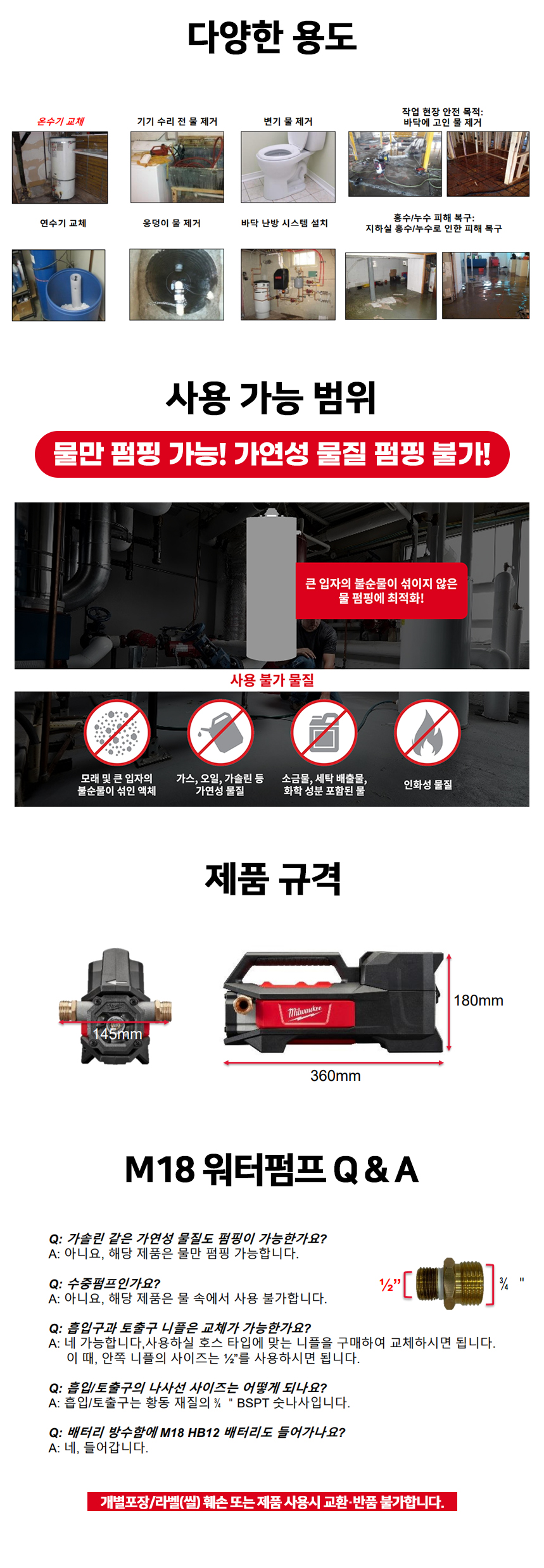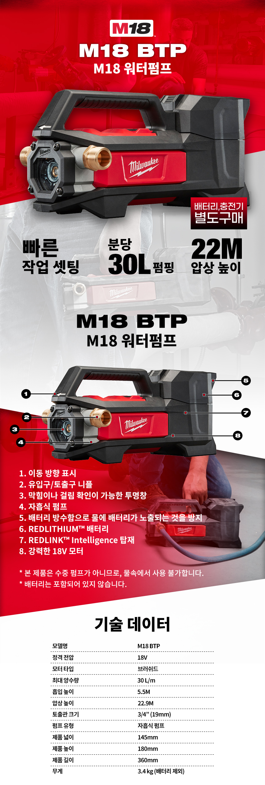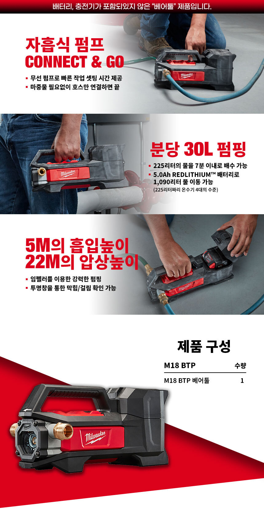 밀워키 18V 충전 워터 펌프 베어툴 M18 BTP-0 자흡식 무선 펌핑 배수 양수기