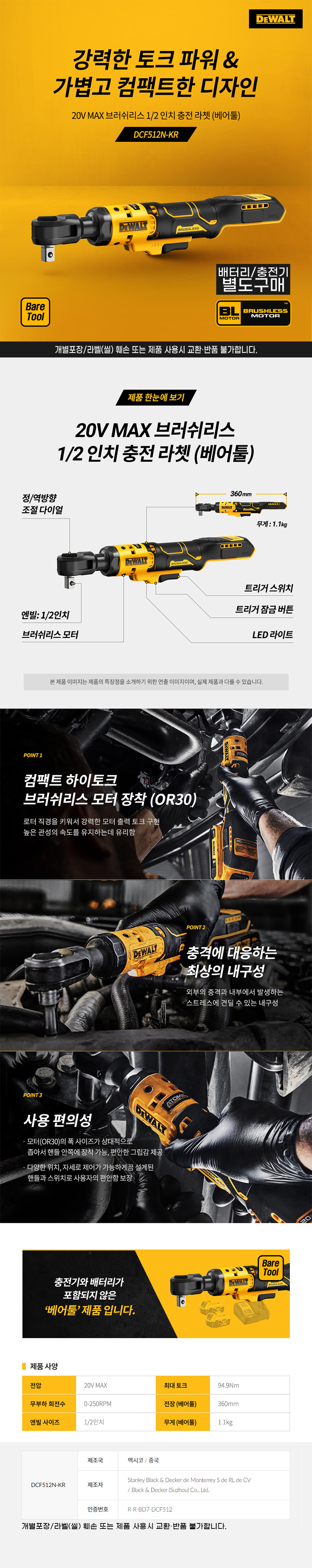 디월트 DCF512N 충전 공구 브러쉬리스 1/2 인치 라쳇 베어툴 20V