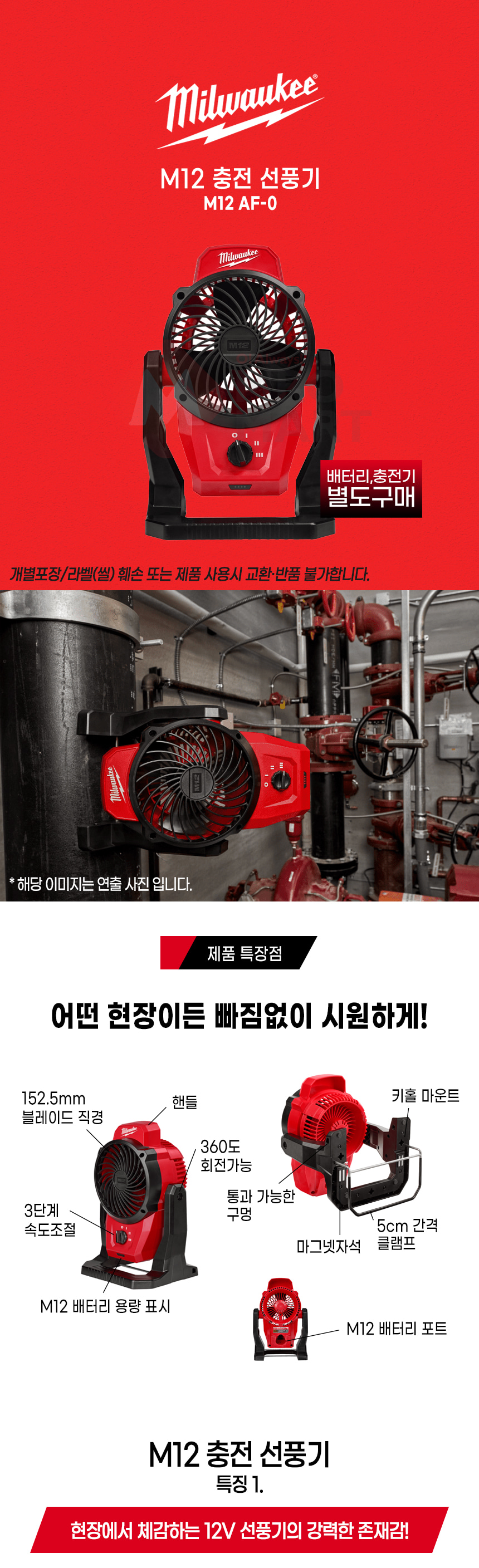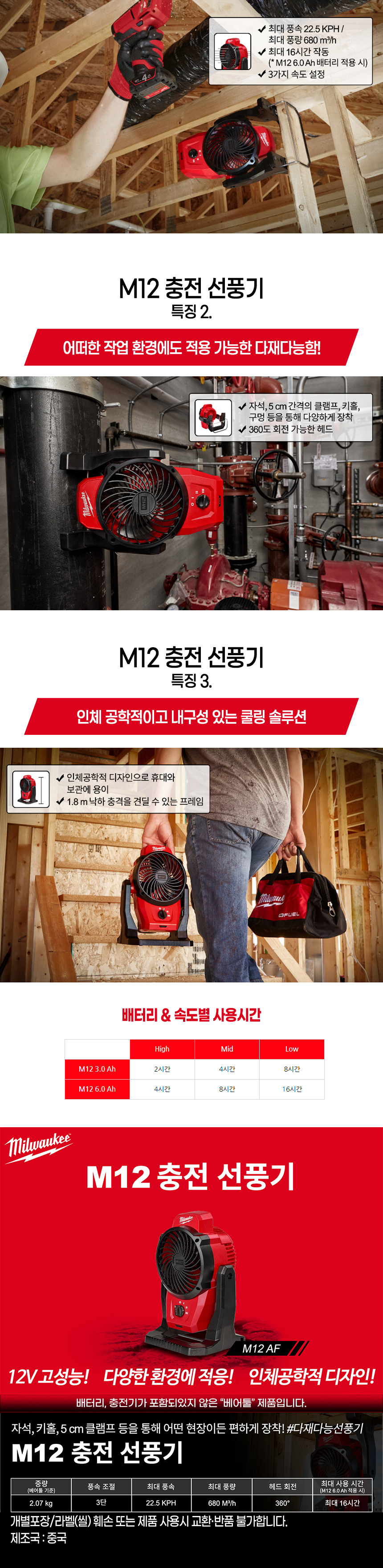 밀워키 12V 충전 선풍기 베어툴 M12 AF-0 속도조절 작업 현장 캠핑 다용도