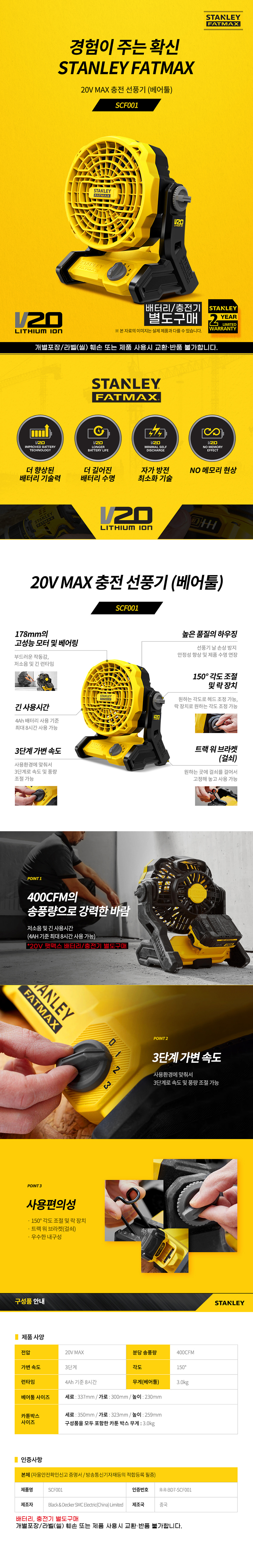 스탠리 20V MAX 팻맥스 충전 선풍기 베어툴 SCF001