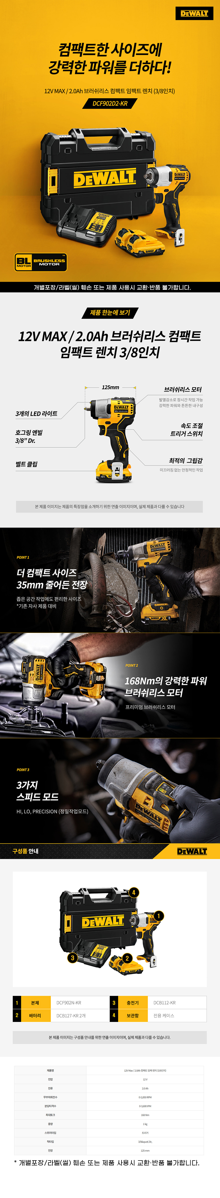 디월트 12V Max 2.0Ah 충전 컴팩트 임팩 렌치 DCF902D2 배터리 세트 3/8인치