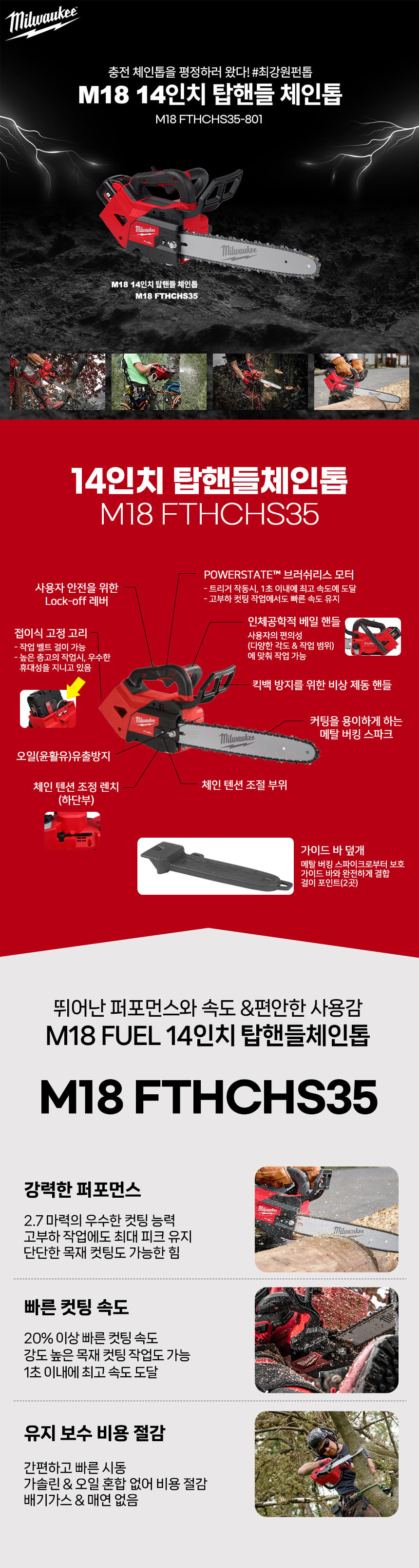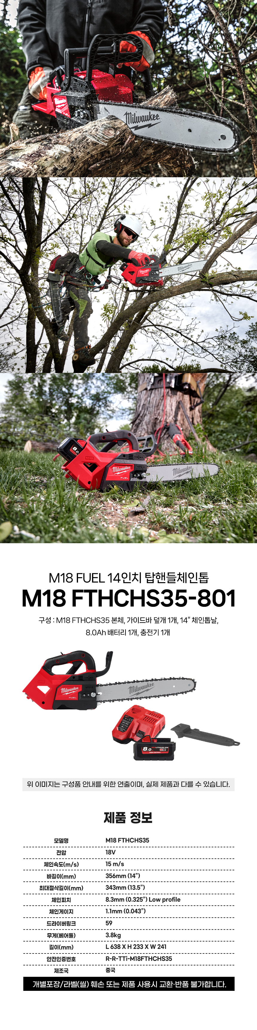 밀워키 18V FUEL 14인치 탑핸들 체인톱 M18 FTHCHS35-801 배터리 세트