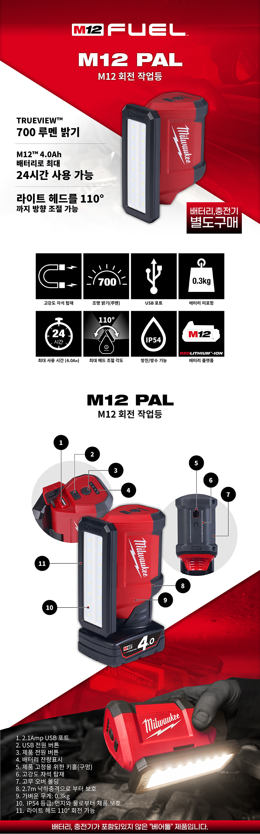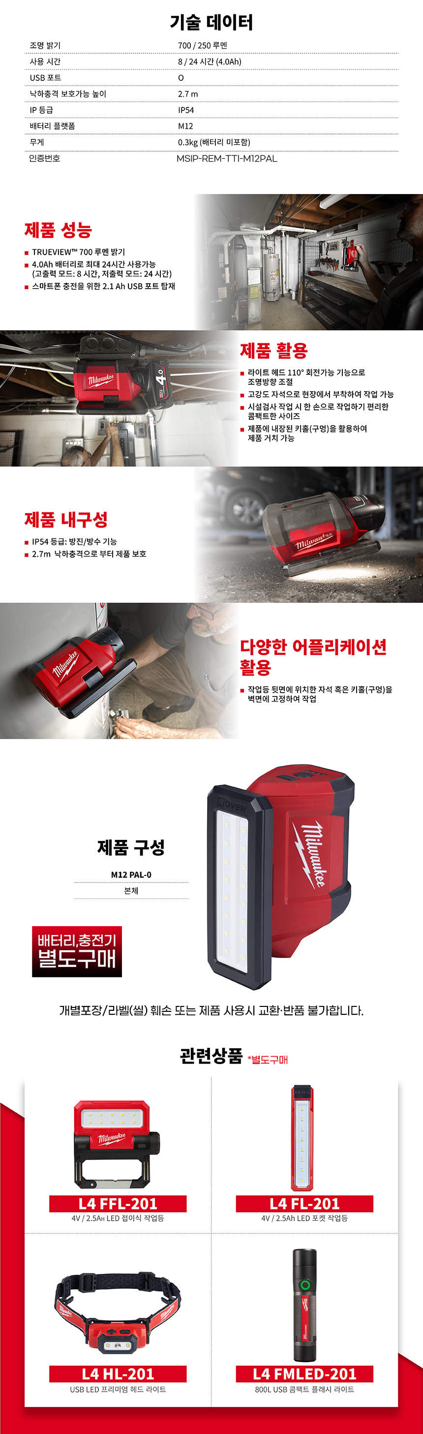 밀워키 12V LED 충전 회전 작업등 M12 PAL-0 랜턴 후레쉬 라이트 캠핑 현장