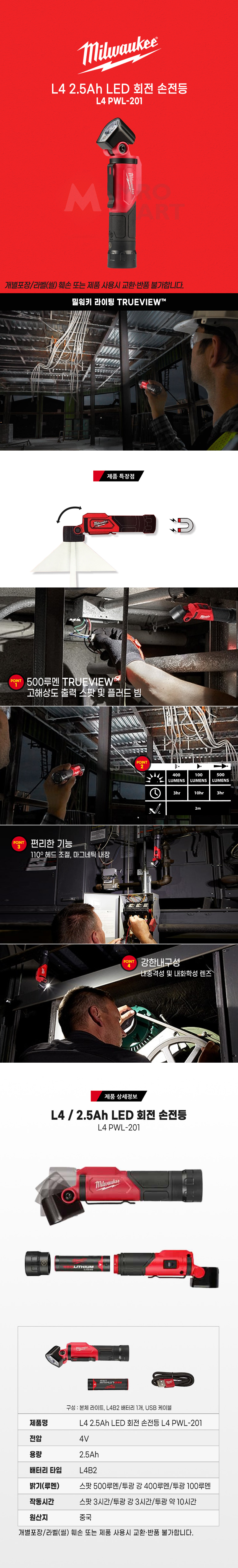 밀워키 L4 2.5Ah LED LED 회전 손전등 L4 PWL-201 라이트 후레쉬 랜턴 캠핑 현장