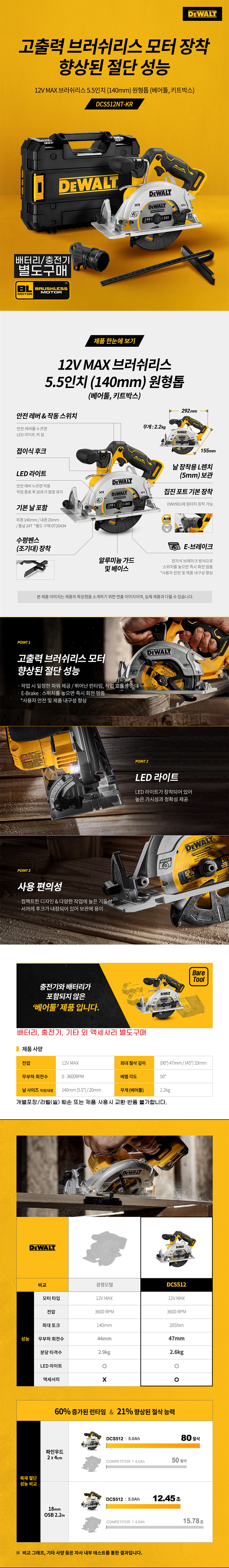 디월트 10.8V 12V 브러쉬리스 5.5인치 원형톱 베어툴 DCS512NT