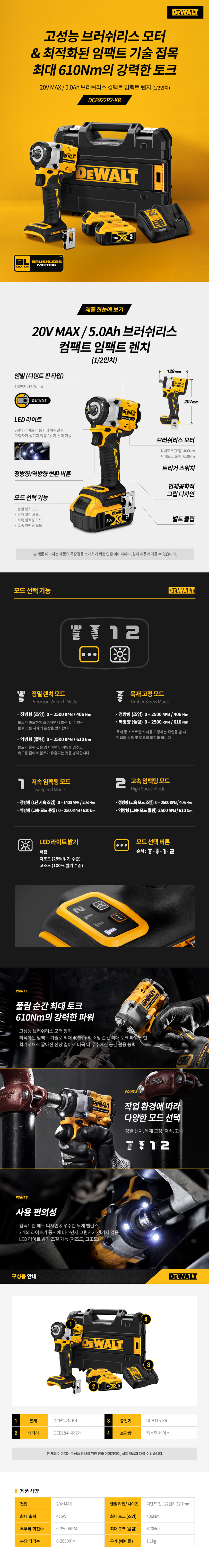 디월트 DCF922P2 충전 브러쉬리스 컴팩트 임팩트 렌치 20V 5.0Ah