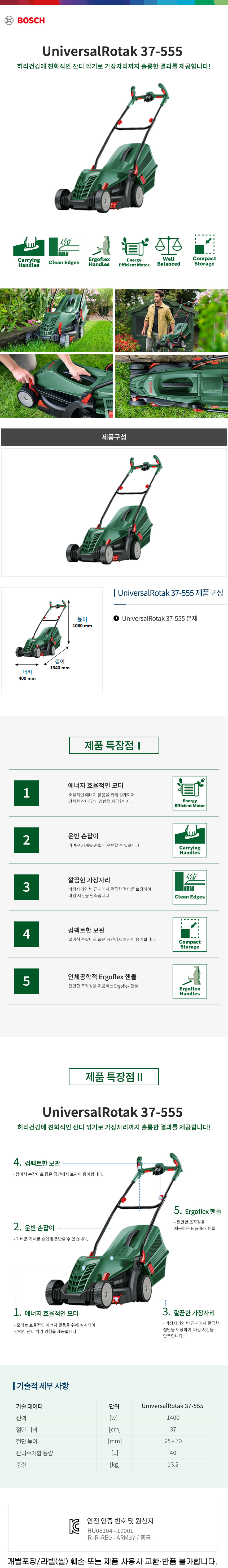 보쉬 가든툴 UniversalRotak 37-555 잔디깍기 06008A65B0 유선 제초기 마당 정원 관리 풀 잔디