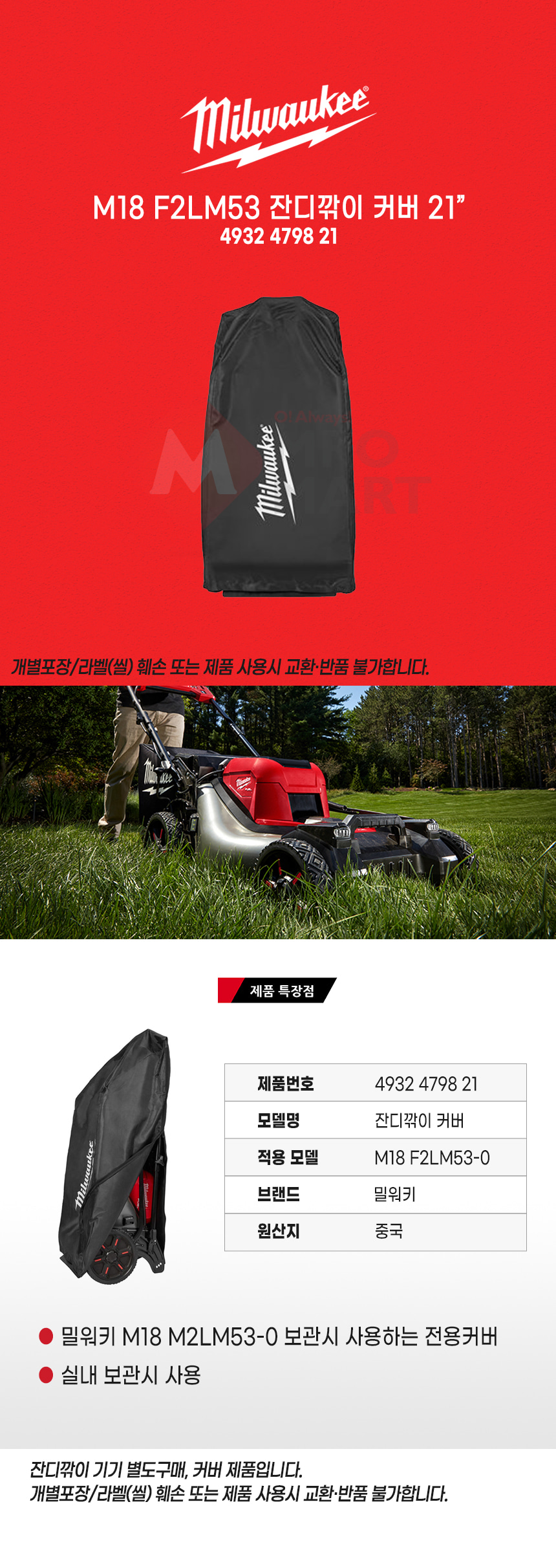 밀워키 M18 F2LM53 잔디깎이 전용 커버 21인치 4932-4798-21 실내 보관