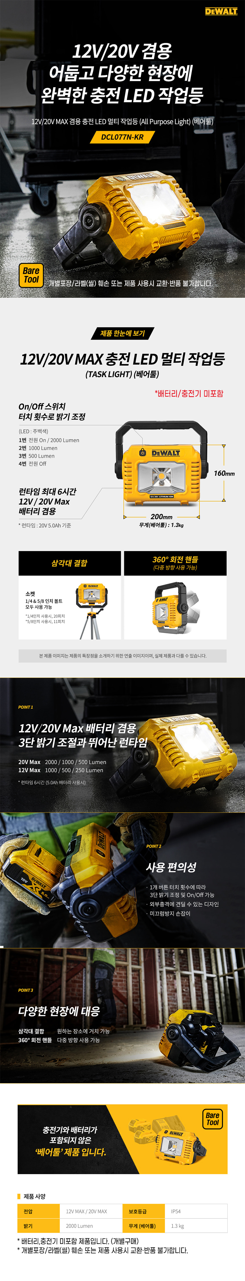 디월트 12V 20V MAX 겸용 충전 LED 멀티 작업등 베어툴 DCL077N 라이트 손전등 후레쉬 랜턴 캠핑 현장