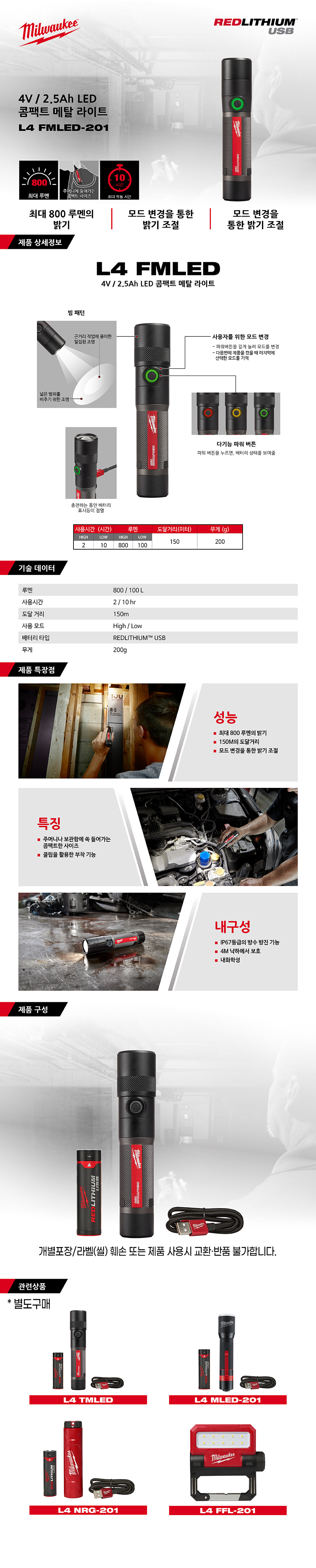 밀워키 L4 / 2.5Ah LED 콤팩트 메탈 라이트 L4 FMLED-201 후레쉬 작업등 캠핑 현장