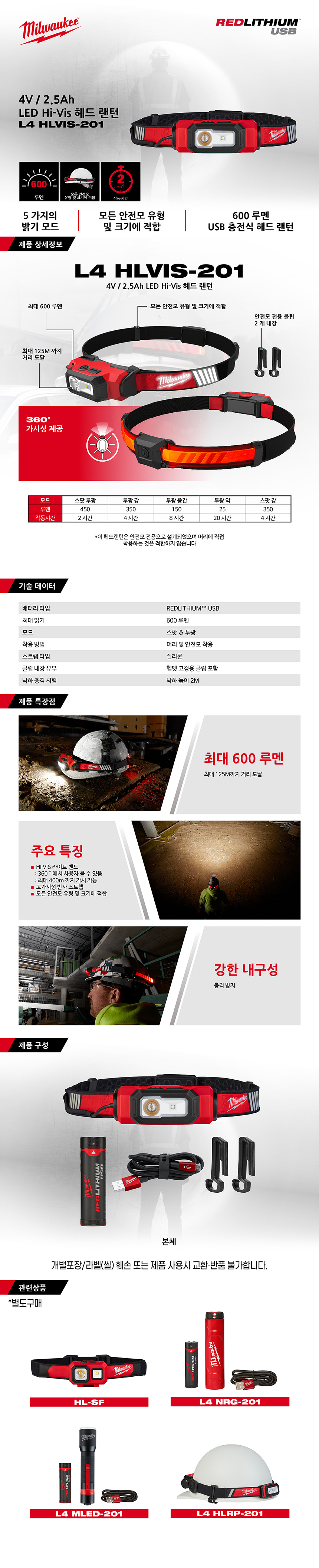 밀워키 L4 / 2.5Ah LED Hi-Vis 헤드 랜턴 L4 HLVIS-201 후레쉬 라이트 작업등 캠핑 현장