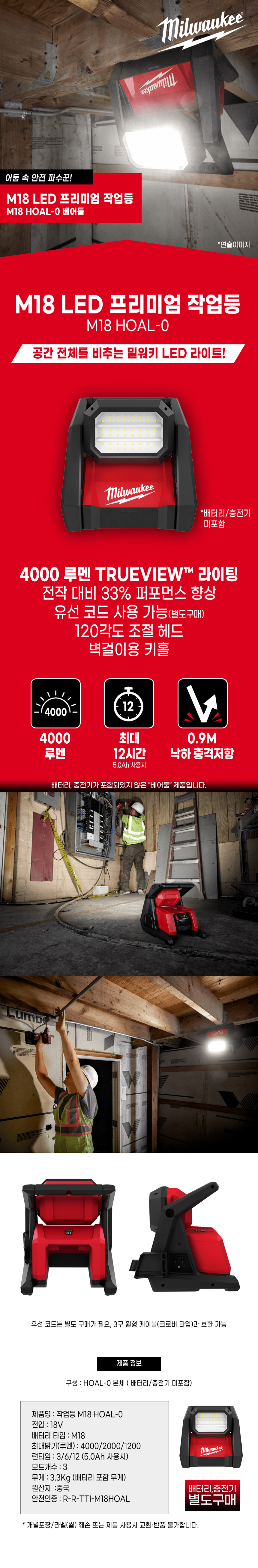 밀워키 18V LED 프리미엄 작업등 베어툴 M18 HOAL-0 랜턴 후레쉬 라이트 캠핑 현장