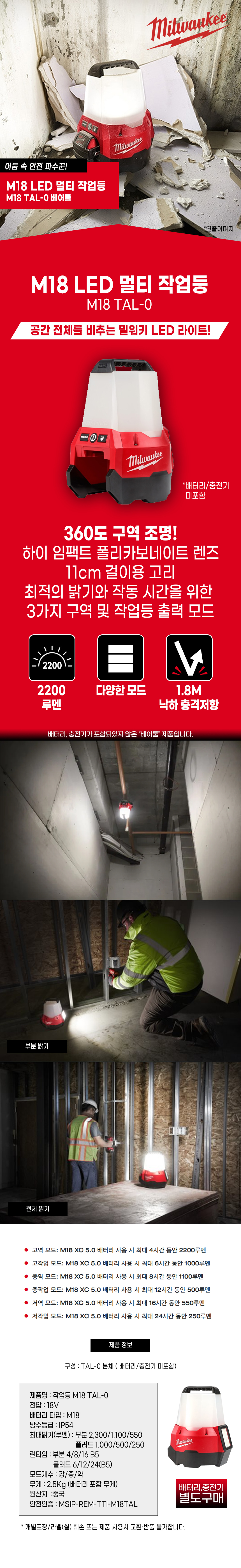 밀워키 18V LED 멀티 작업등 베어툴 M18 TAL-0 랜턴 후레쉬 라이트 캠핑 현장