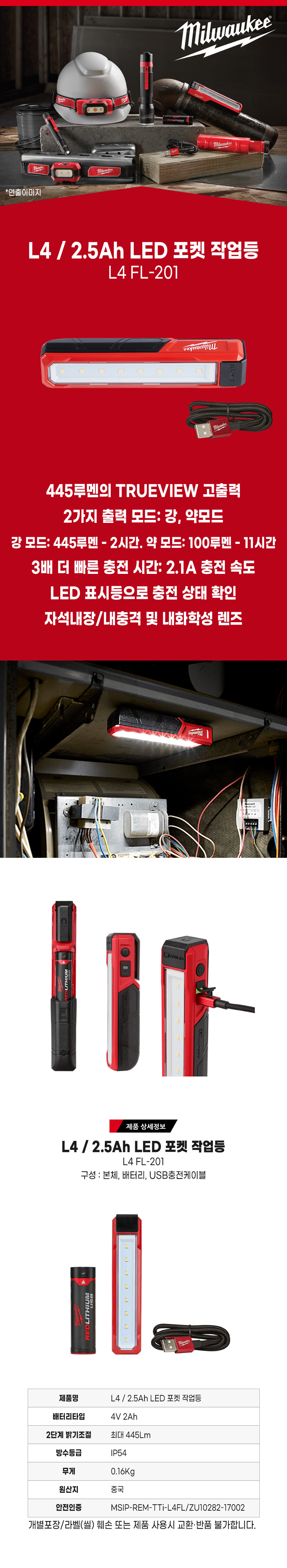 밀워키 L4 2.5Ah LED 포켓 작업등 L4 FL-201 라이트 손전등 후레쉬 랜턴