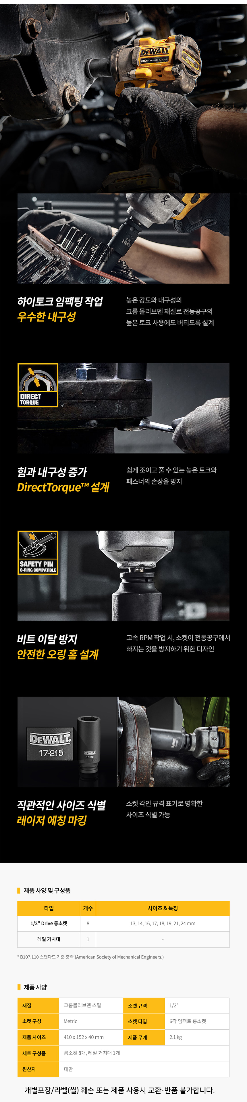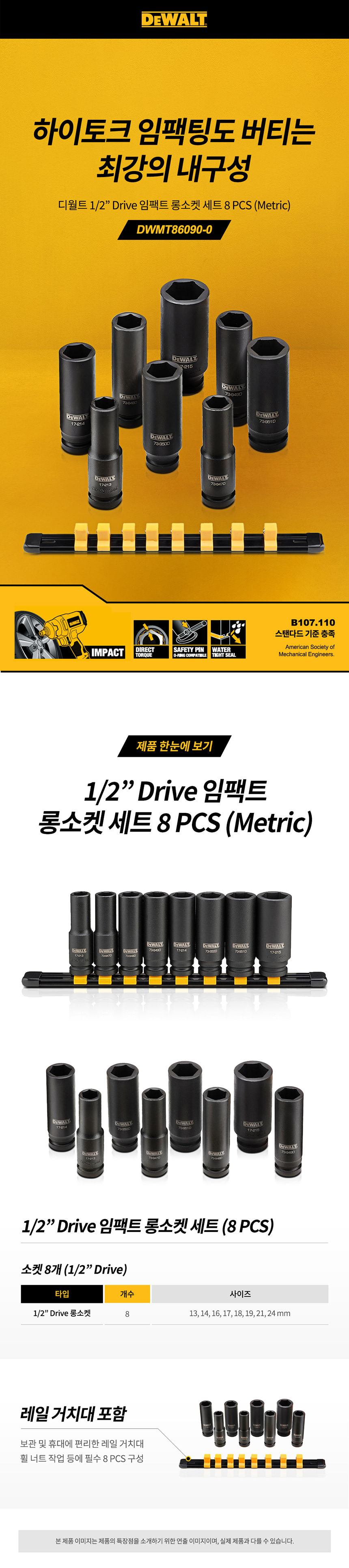 디월트 1/2인치 Drive 임팩트 롱소켓 세트 8팩 (Metric) DWMT86090 육각 복스대 복스알 라쳇 복스 렌치
