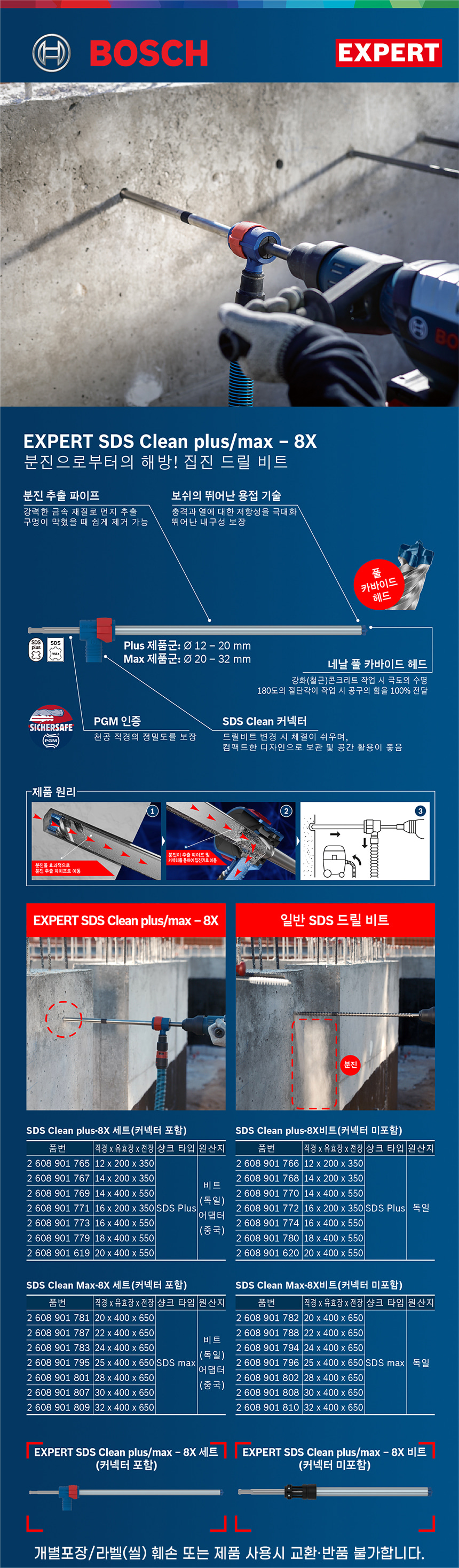 보쉬 EXPERT SDS Clean plus-8X 12x200x350mm 해머 드릴비트 커넥트 세트 2608901765 분진 날림 방지