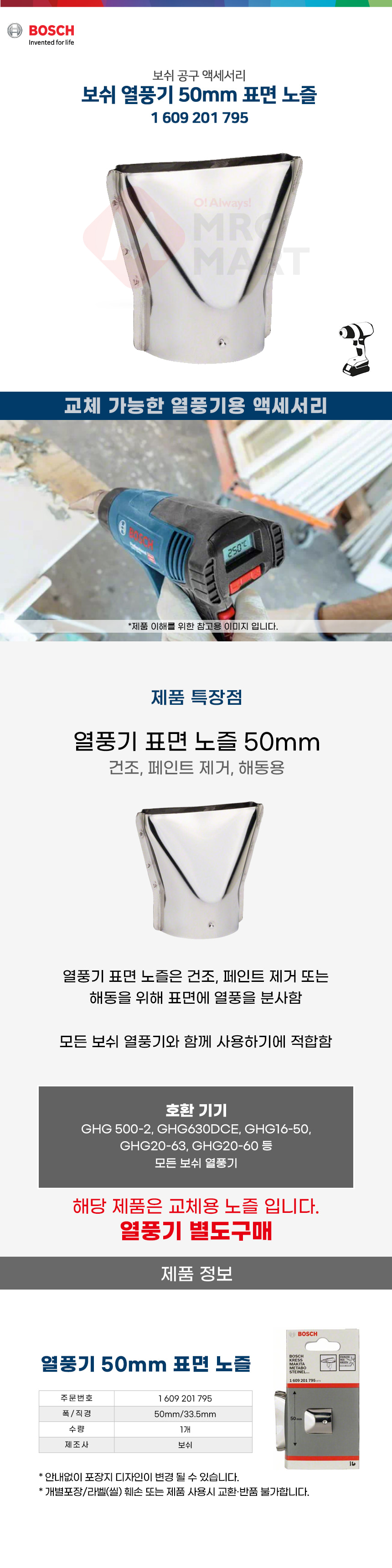 보쉬 열풍기 50mm 표면 노즐 1609201795 교체 액세서리 전용 GHG 20-60 20-63 16-50 500-2 히팅건 핫건