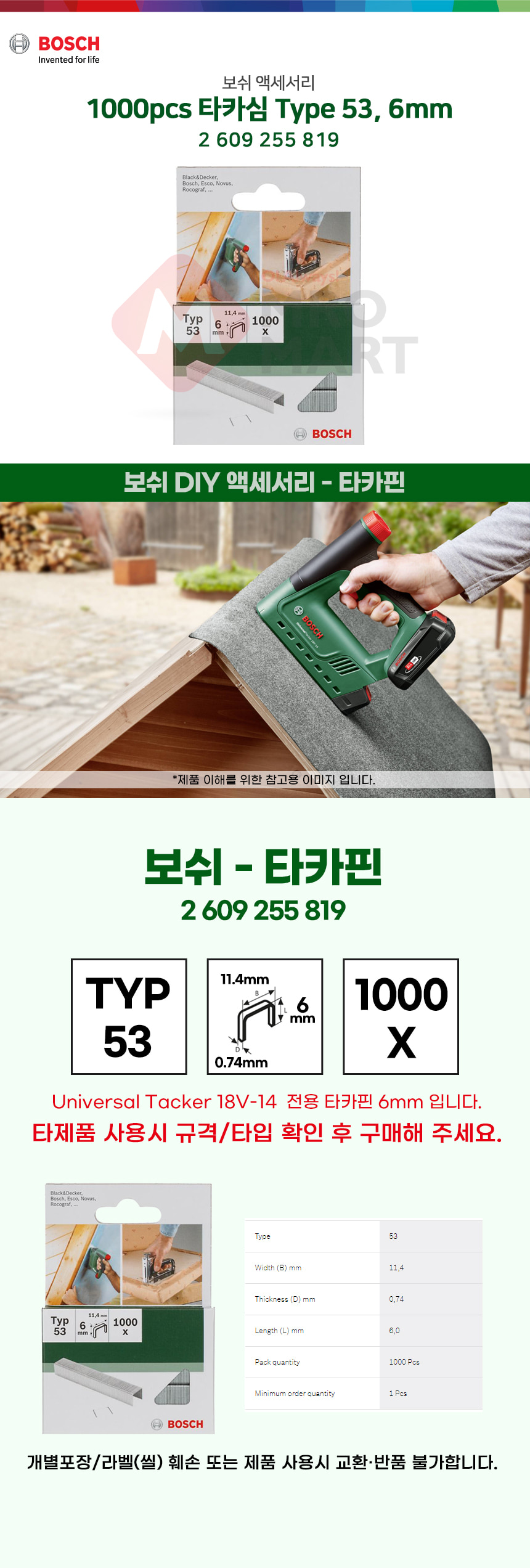 보쉬 충전 타카핀 타카심 스테이플러심 ㄷ자형 type53 6mm 1000pcs 2609255819