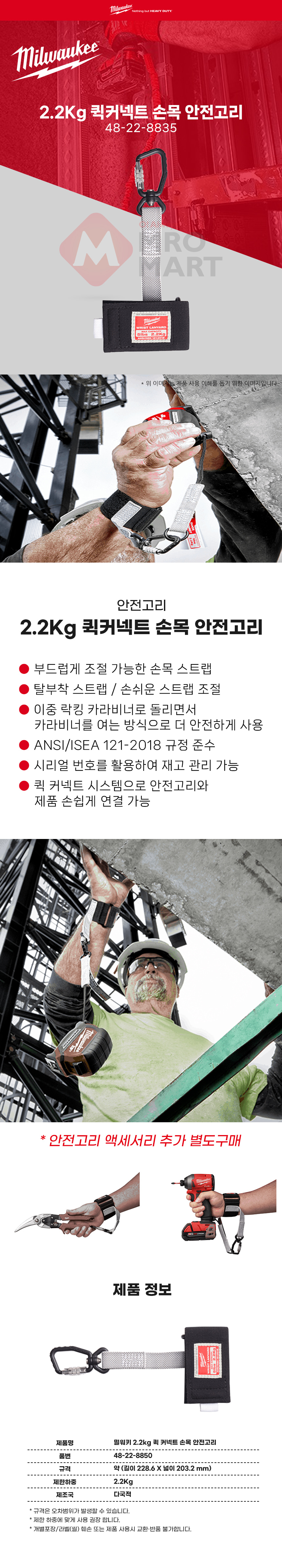 밀워키 48-22-8835 2.2Kg 퀵 커넥트 손목 안전 고리 공구 걸이 로프 낙하 방지