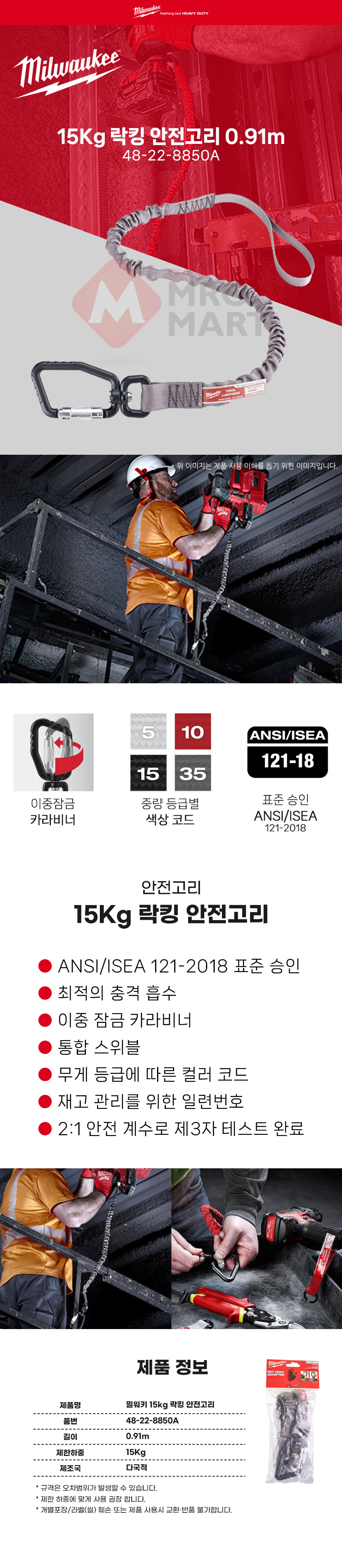 밀워키 48-22-8850A 15Kg 락킹 안전 고리 0.91m 공구 걸이 로프 낙하 방지