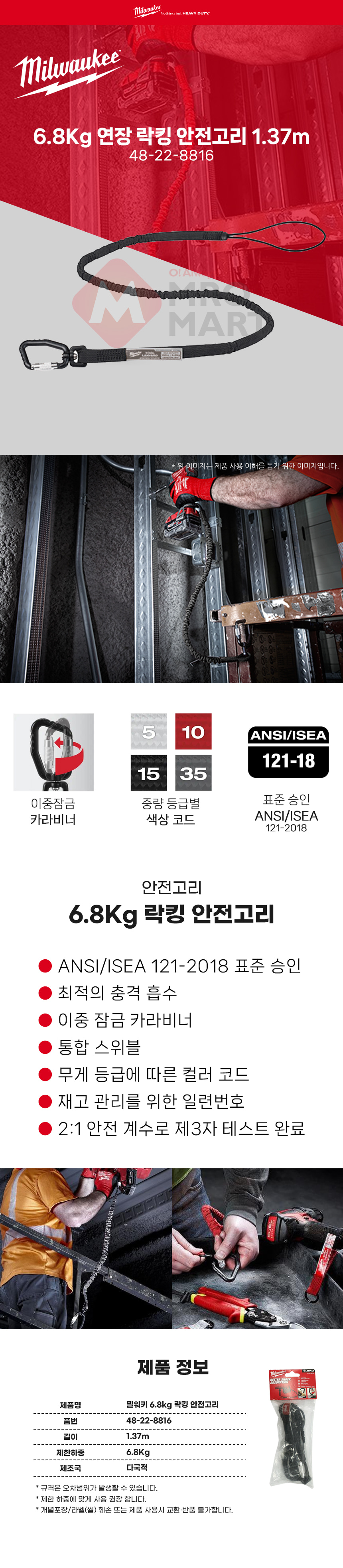 밀워키 48-22-8816 6.8Kg 연장 락킹 안전 고리 1.37m 공구 걸이 로프 낙하 방지