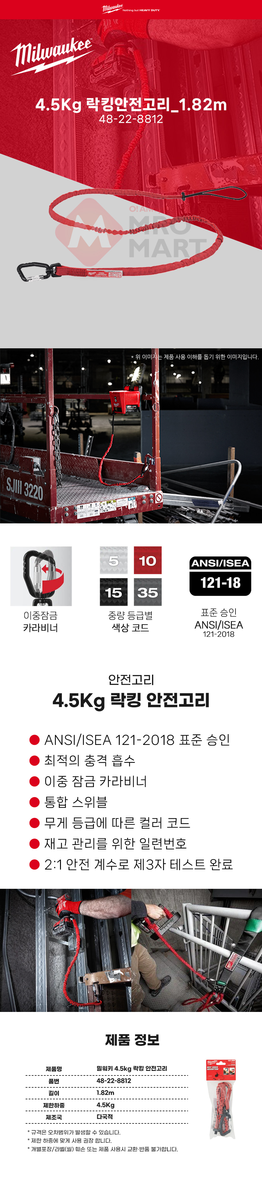 밀워키 48-22-8812 4.5Kg 연장 락킹 안전 고리 1.82m 공구 걸이 로프 낙하 방지