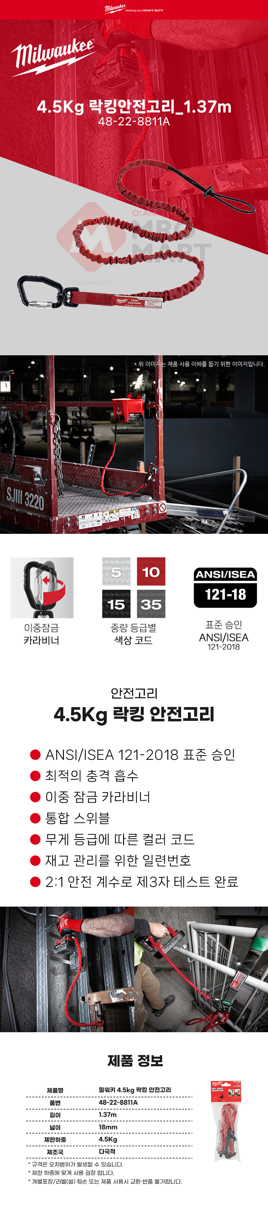 밀워키 48-22-8811A 4.5Kg 연장 락킹 안전 고리 1.37m 공구 걸이 로프 낙하 방지