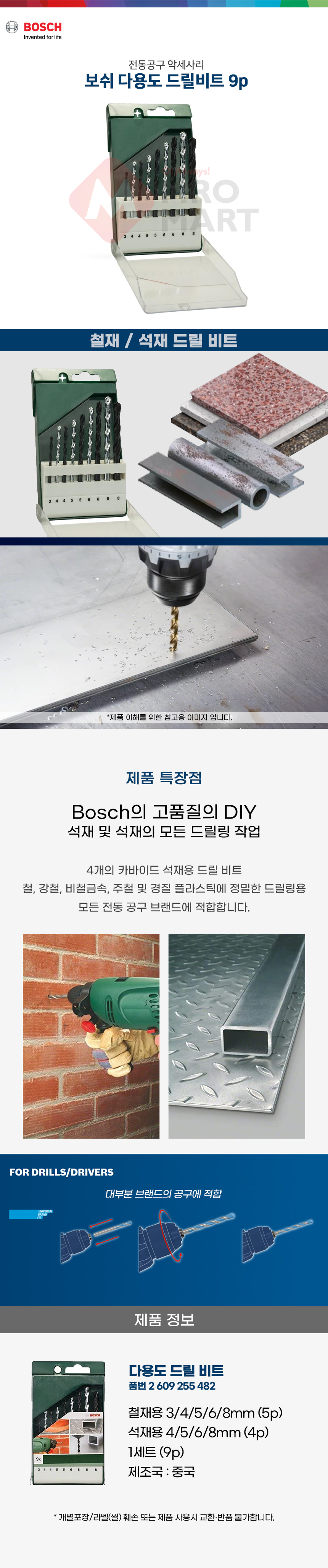 보쉬 다용도 드릴 비트 세트 9p 2609255482 석재 철재 드릴용