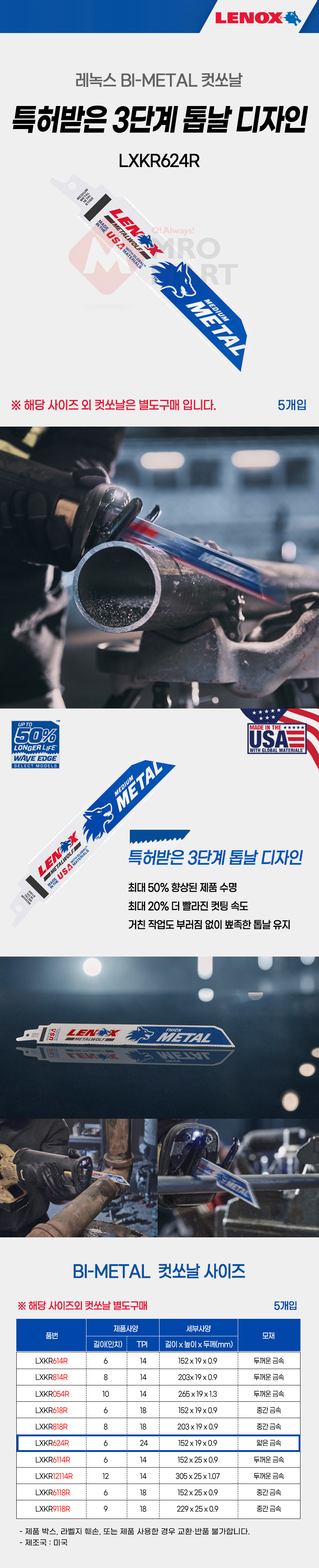 레녹스 바이메탈 컷쏘날 LXKR624R 6인치 24TPI 얇은 금속 절단용 5pcs