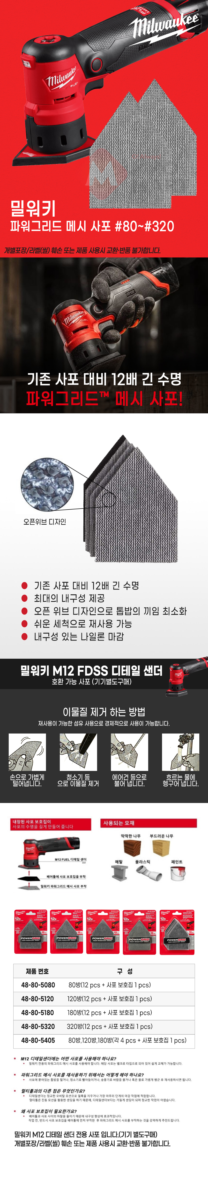 밀워키 파워그리드 메시 사포 48-80-5080 80방 M12 FDSS 전용 망사 페파 샌딩 페이퍼