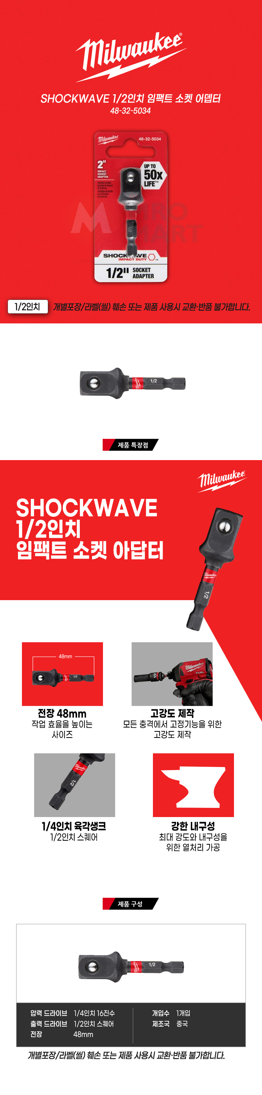 밀워키 48-32-5034 SHOCKWAVE 1/2인치 임팩트 소켓 어뎁터 아답터 복스알 비트 임팩용