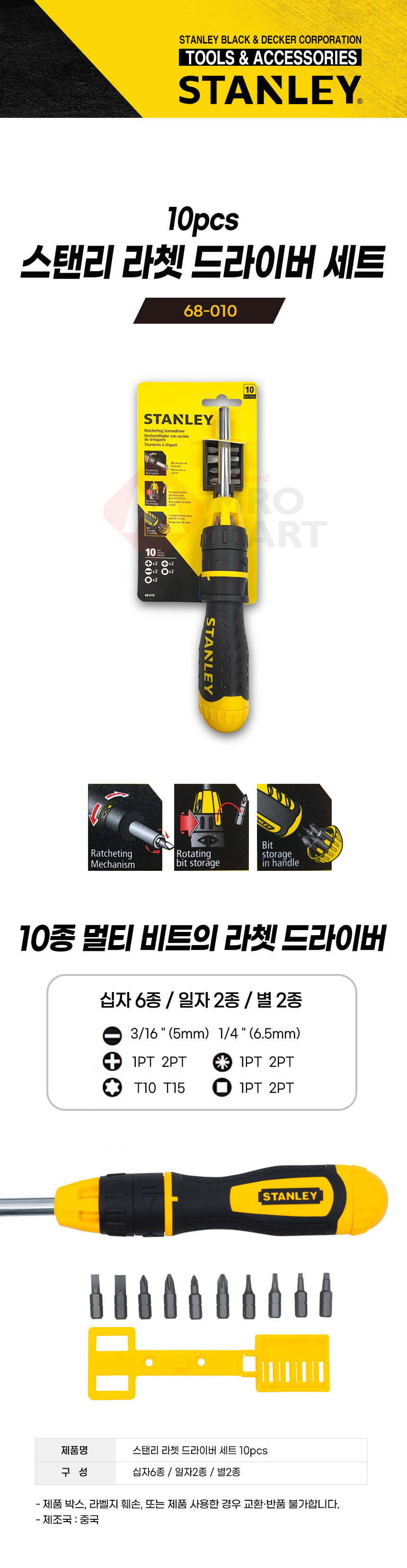 스탠리 68-010 라쳇 멀티 스크류 드라이버 세트 십자 일자 별 비트 10pcs