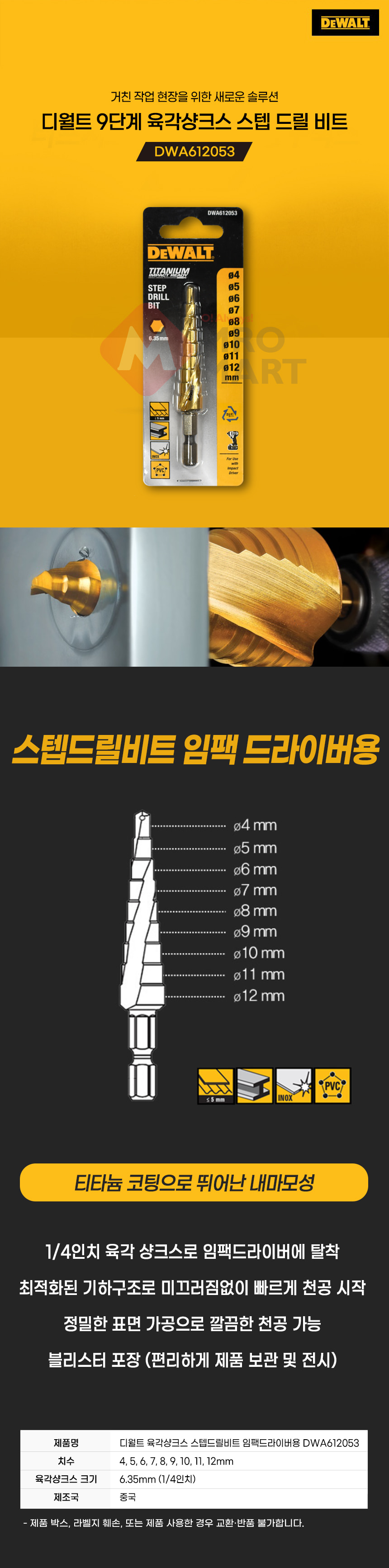 디월트 DWA612053 스텝 드릴 비트 임팩용 홀쏘 천공 4-12mm