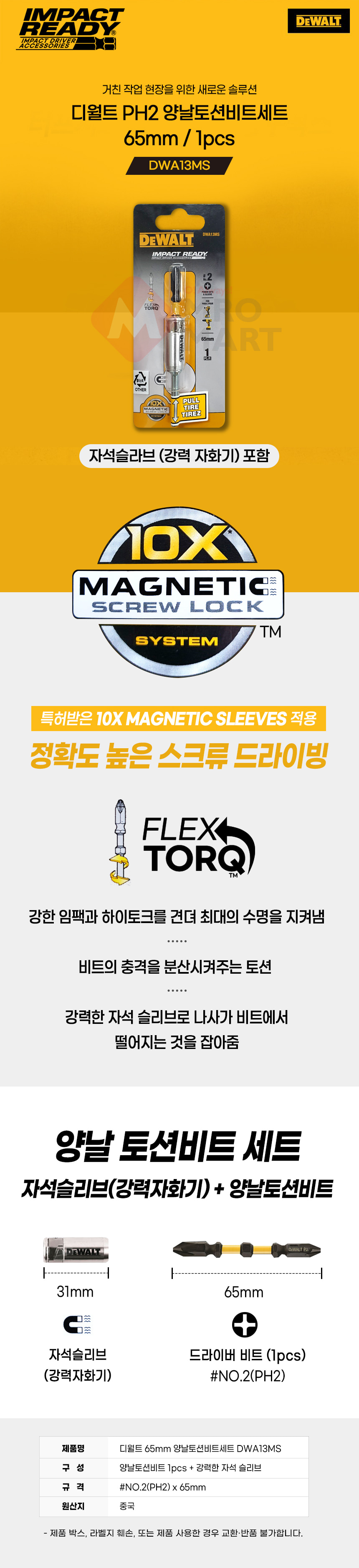 디월트 PH2 양날 토션비트 세트 65mm 1pcs (자화기 포함) DWA13MS