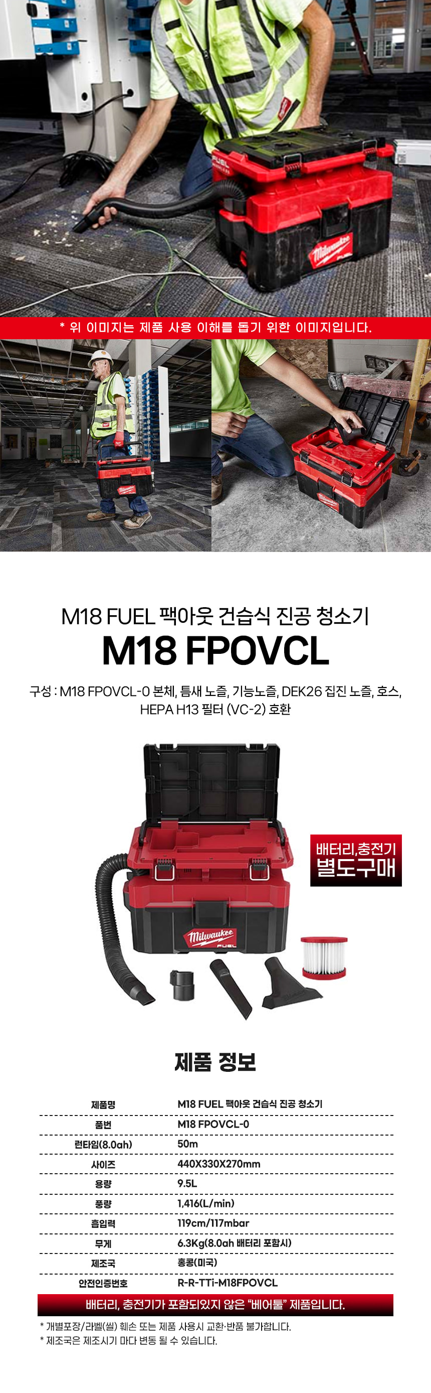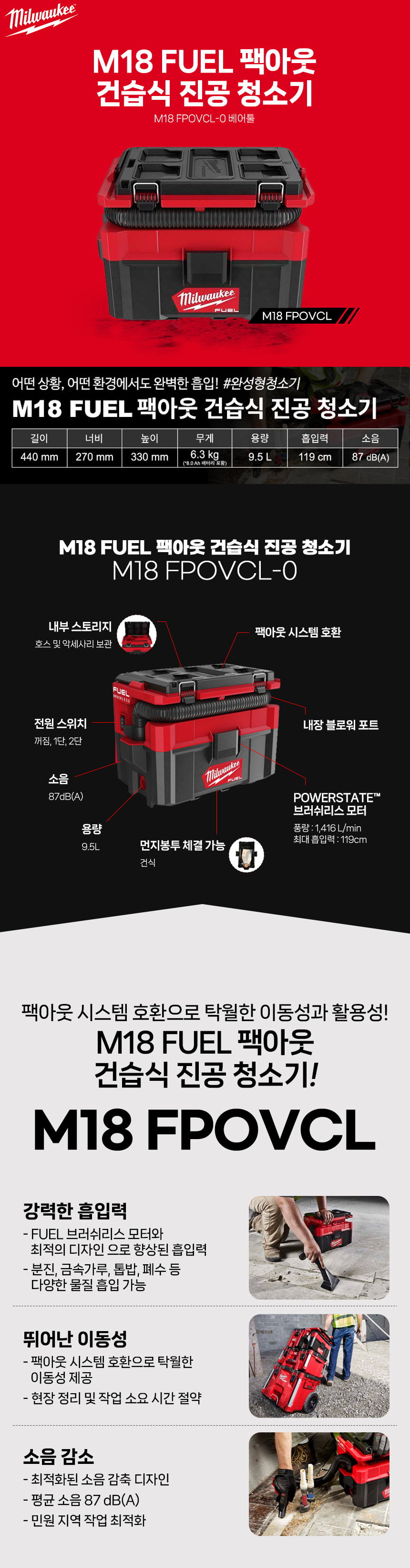 밀워키 FUEL 팩아웃 충전 건습식 진공 청소기 베어툴 M18 FPOVCL-0