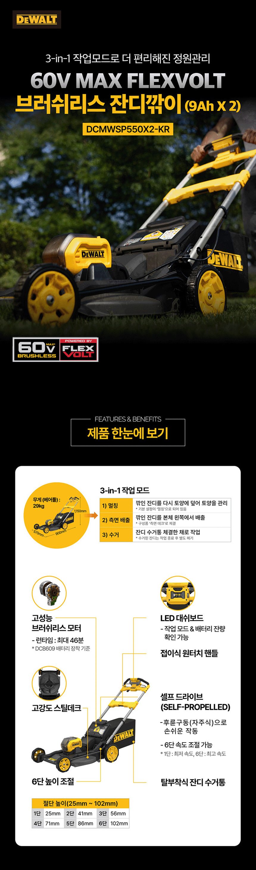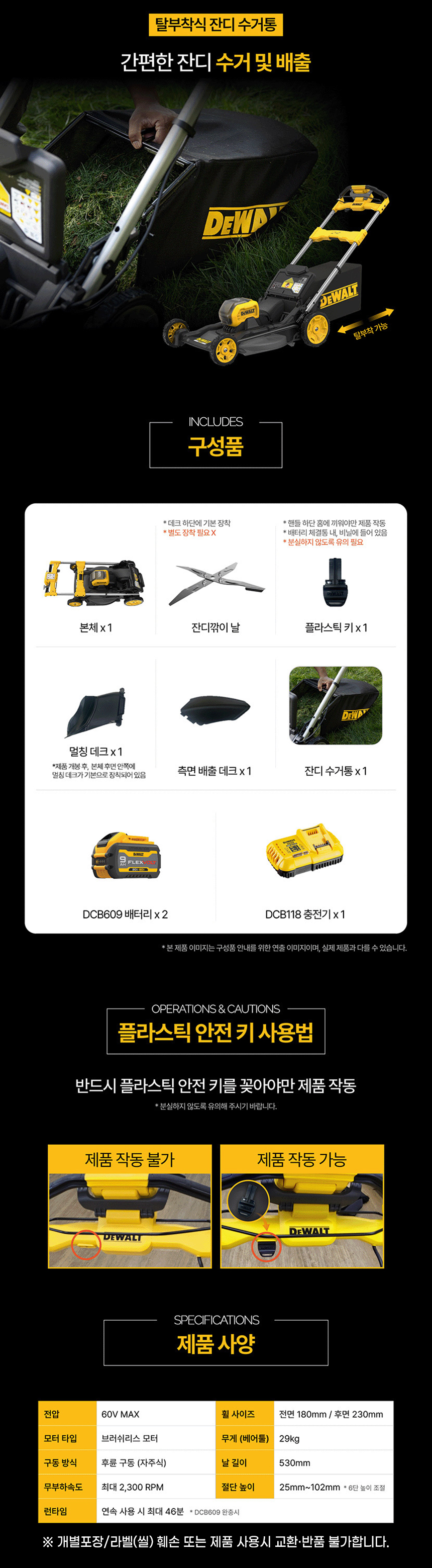 디월트 60V MAX 9.0Ah 플렉스볼트 충전 브러쉬리스 잔디깎이 세트 DCMWSP550X2 제초 정원 잡초