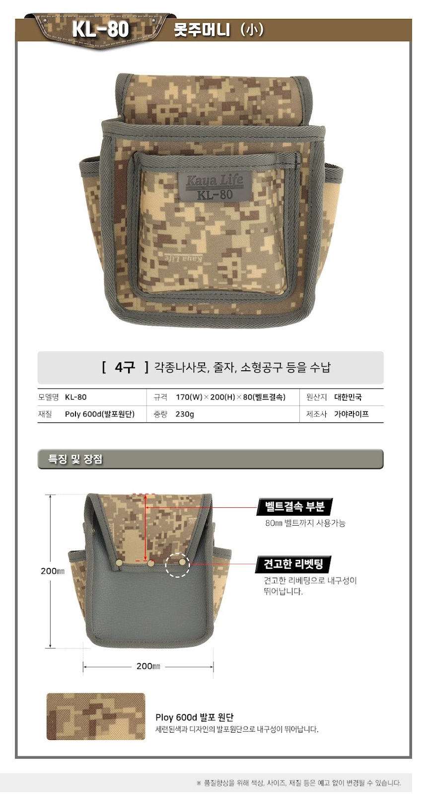 가야라이프 못주머니 KL-80 미니 4구 공구 파우치 작업 벨트 수공구 수납 가방