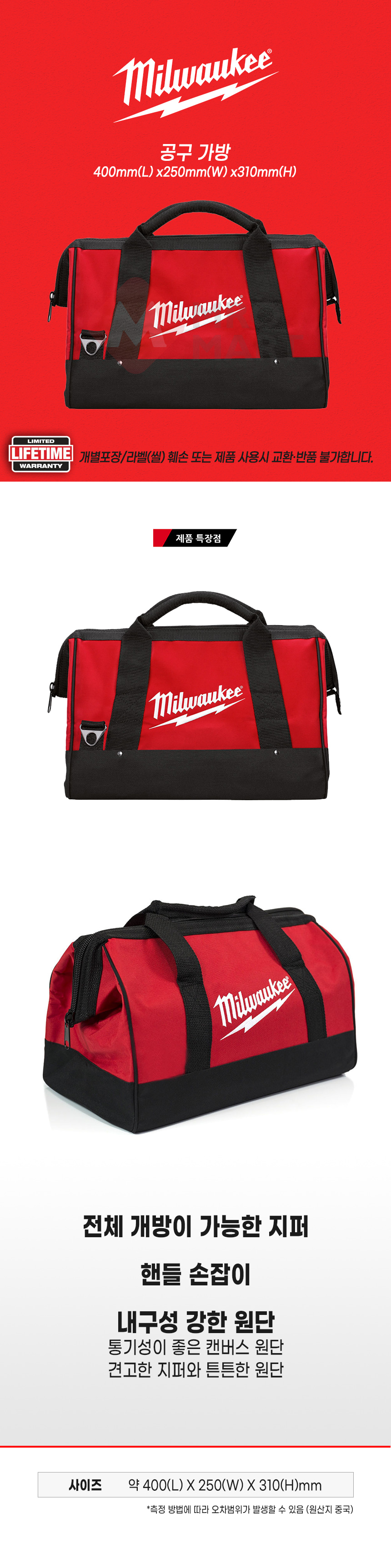 밀워키 공구 가방 400mm(L) x250mm(W) x310mm(H)