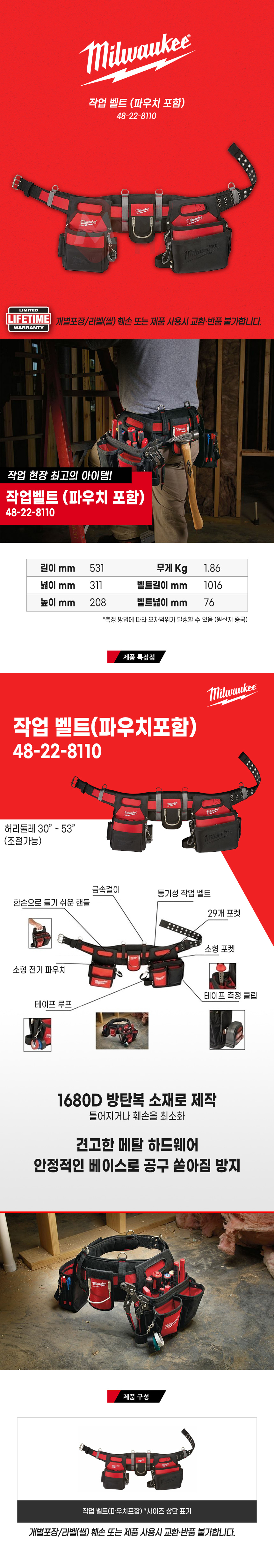 밀워키 48-22-8110 작업 벨트 파우치포함 포켓 전공 공구 걸이 툴 벨트 공구집