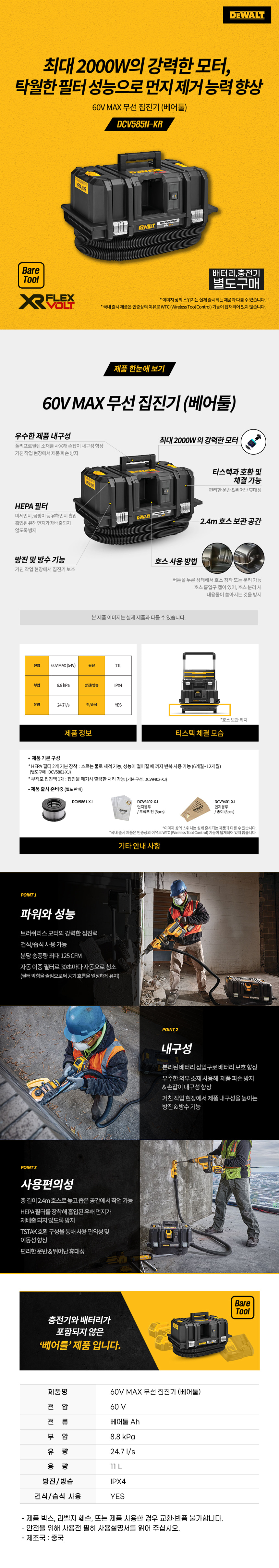 디월트 60V 54V MAX 충전 무선 집진기 베어툴 배터리 충전기 미포함 DCV585N
