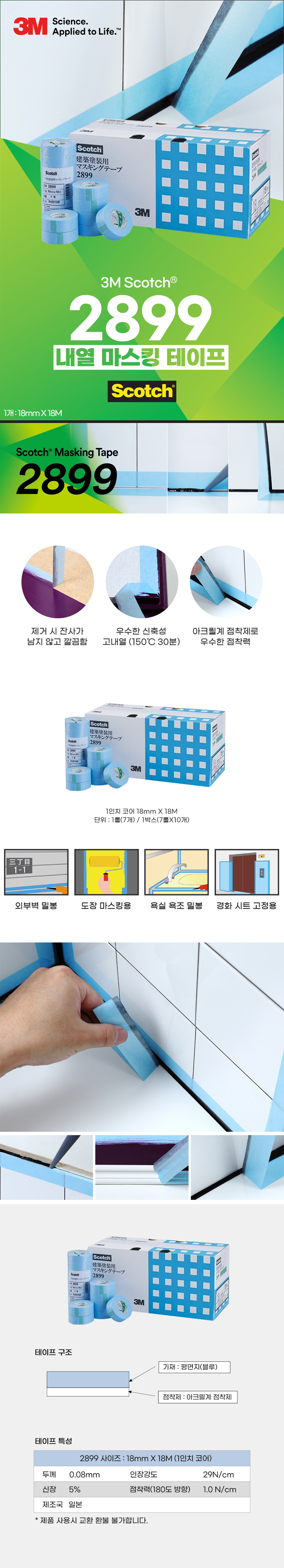 3M 2899 블루 내열 와시 마스킹 테이프 18mm X 18M 건축 실링 보수 도장