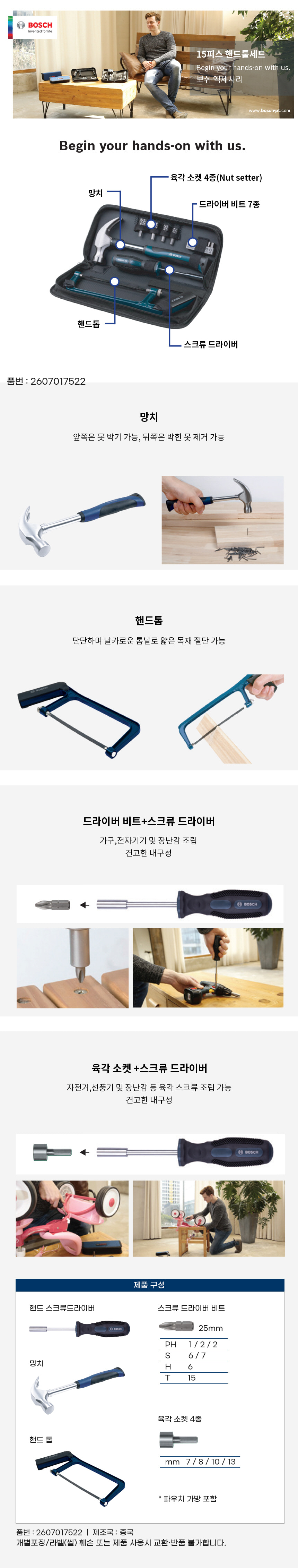 보쉬 수공구 세트 15P 2607017522 스크류 드라이버 비트 망치 톱