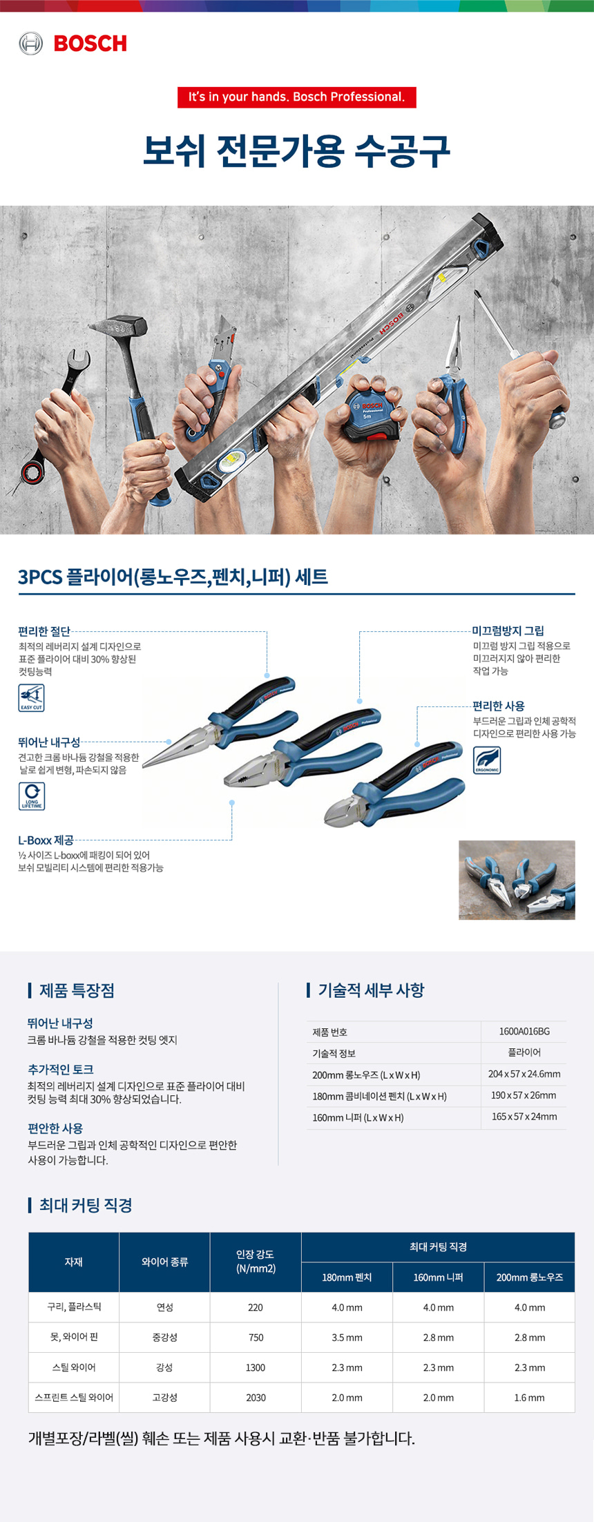 보쉬 3P 플라이어 세트 롱노우즈 펜치 니퍼 1600A016BG 수공구