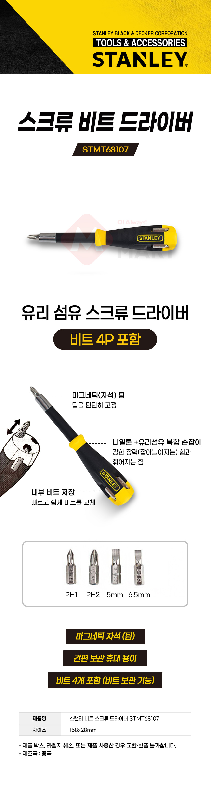 스탠리 STMT68107 스크류 비트 드라이버 세트 자석 비트 4P 포함 십자 일자 수공구