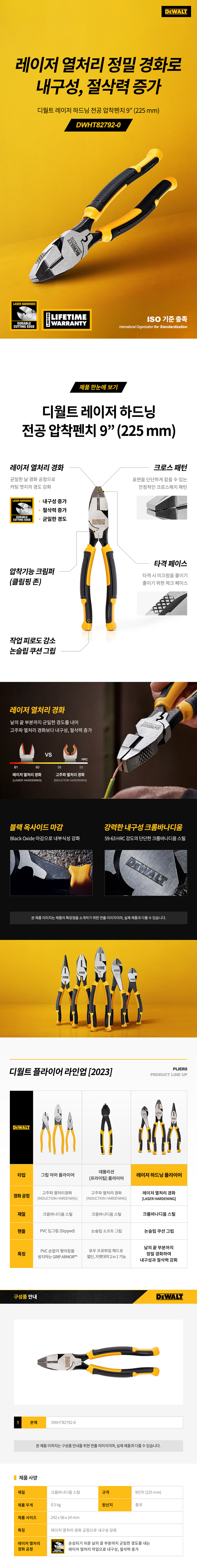 디월트 레이저 하드닝 전공 압착 펜치 9인치 225mm DWHT82792-0 수공구 뺀찌 뺀치 플라이어
