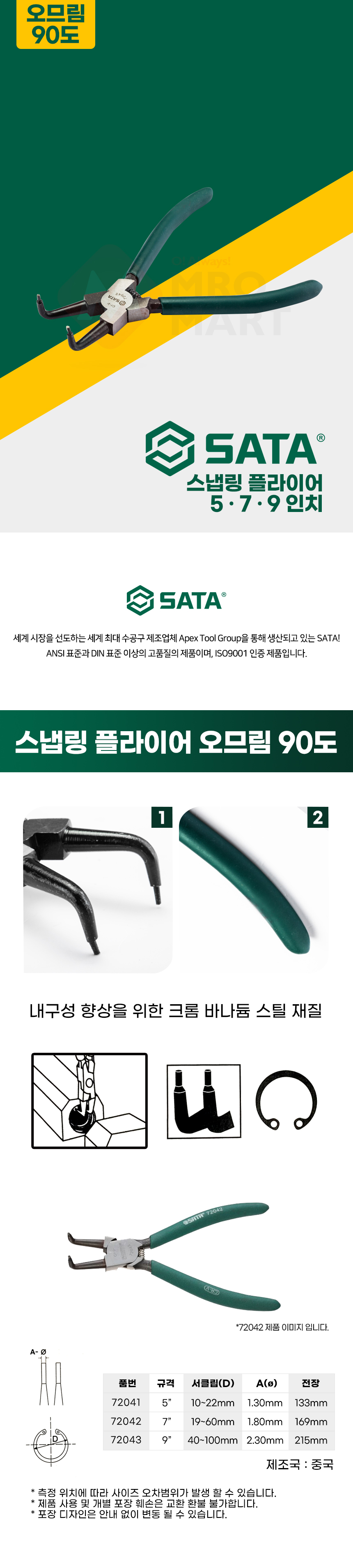 사타 스냅링 플라이어 오므림 90도 72043 9인치 수공구